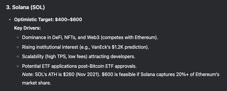 この強気のトレンドが夏まで続くなら、ソラナの価格は初秋に320ドルに達する可能性があります。持続的な上昇の勢いは、DeepSeekのベンチマーク目標を超える可能性があり、いくつかのモデルは、より広範な条件が一致すれば、価格が400ドルから600ドルの間でピークに達する可能性があると予測しています。