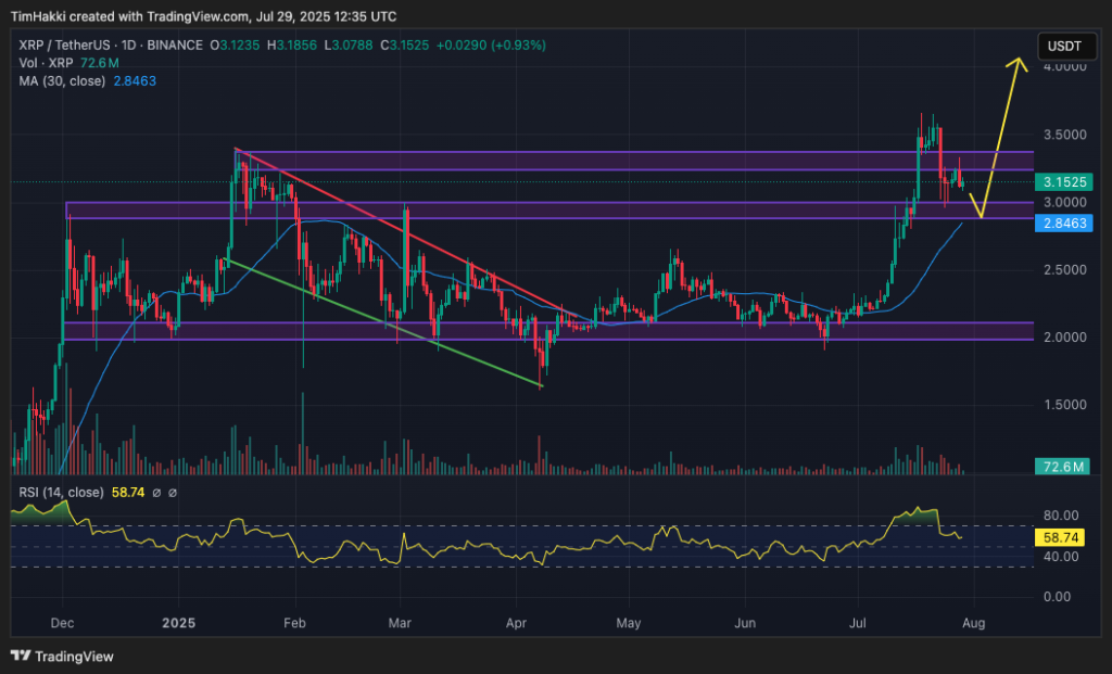 この強気な予測は、XRPの最近の市場動向と一致しています。7月18日、XRPは3.65ドルの史上最高値を記録し、2018年に達成した3.40ドルの最高記録を最終的に上回りました。過去1か月で、このトークンは43.5%上昇し、ビットコインや多くのアルトコインの競争相手を超えました。