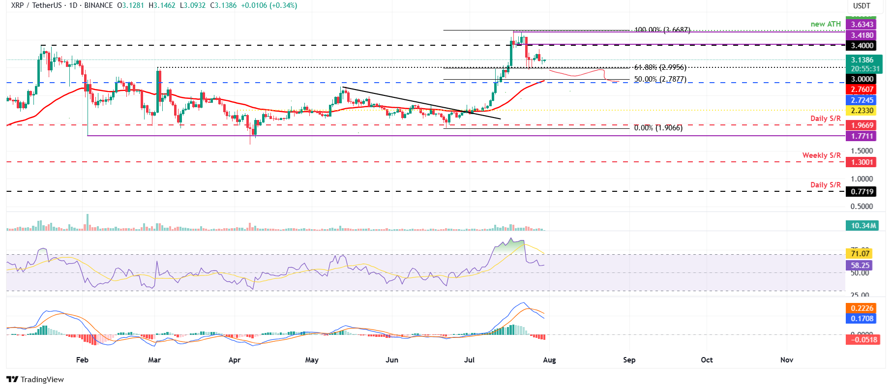 XRP価格は7月23日に3.40ドルのデイリーサポートレベルを下回り、翌日に11%下落しました。しかし、その価格は先週の金曜日に再度テストされ、61.8%フィボナッチレベル(2.99ドル)付近でサポートを見つけ、週末に3.43%反転しました。今週初めの月曜日、XRPは3.5%調整し、翌日には3.12ドル前後をうろうろしています。水曜日にこの記事を書いている時点で、価格は3.13ドル前後で安定し続けています。