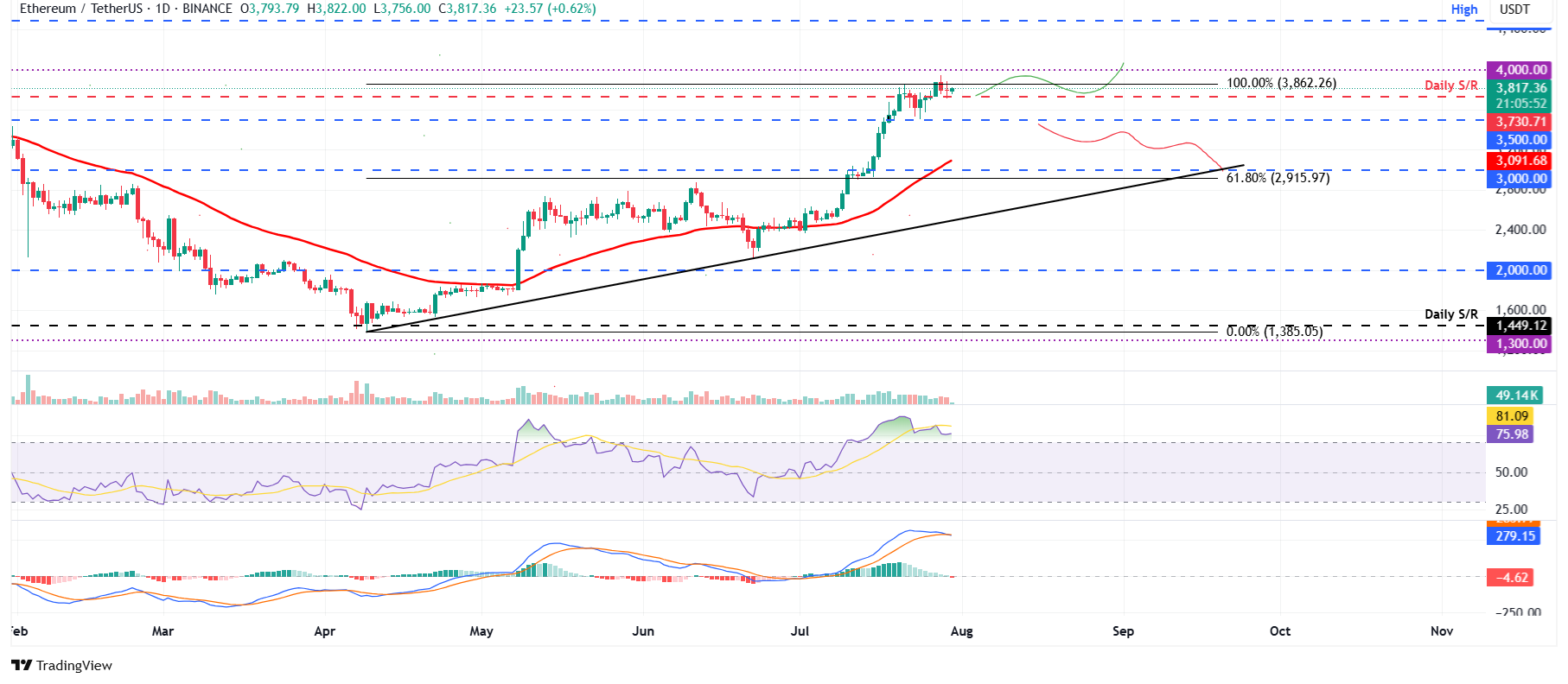 一方、ETHが調整に直面し、日々のサポートレベル3,730ドル以下で終わる場合、下落トレンドは次のサポートレベル3,500ドルまで継続する可能性があります。