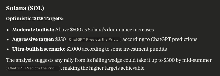 クロードは、ソラナの価格が年末までに1,000ドルに達する可能性があり、今年の初めに記録された293.31ドルの歴史的な高値の3倍以上になると予測しており、新年には6倍に達することが期待されています。
