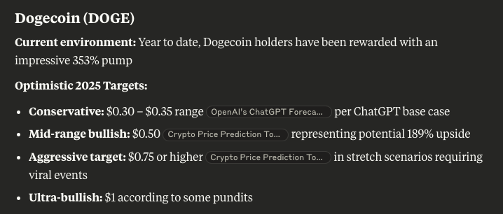 クロードは、2025年末までにDOGEの価格が0.1ドルに達する可能性があり、現在の価格水準の約5倍のリターンになると予測しています。