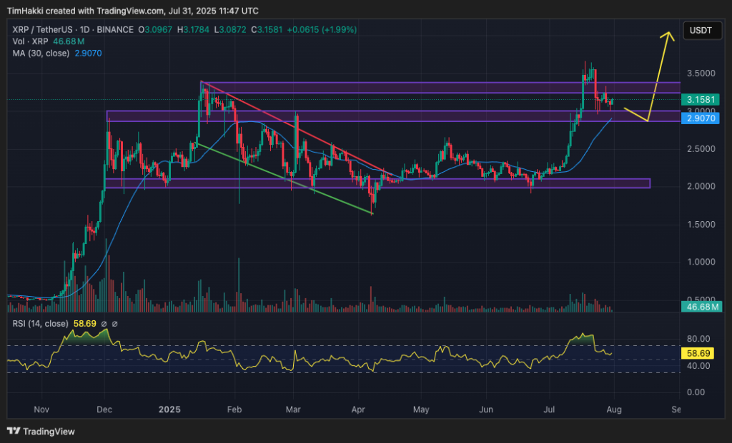 この楽観的な見通しは、XRPの最近数週間の強力なパフォーマンスに起因しています。7月18日、この資産は3.65ドルの歴史的最高値を記録し、2018年の3.40ドルのピークを突破しました。その後、13.3%下落しましたが、XRPは過去1ヶ月で43%以上急上昇し、ビットコインや他の主要アルトを超えました。