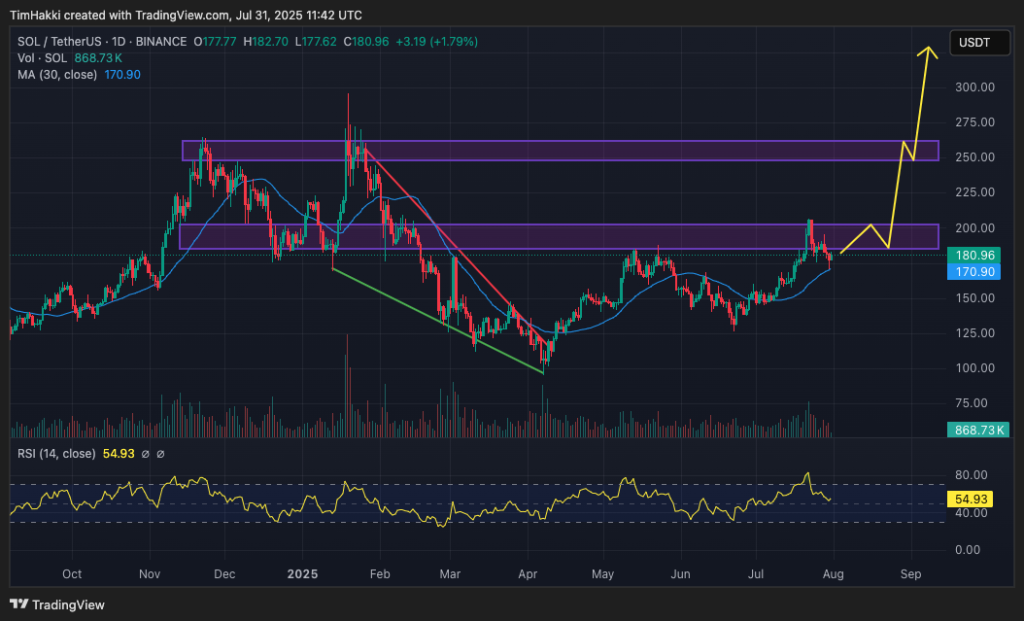 テクニカル面では、SOLは数ヶ月にわたる下落トレンドを転換しました。1月に250ドルを超えるピークに達し、4月には100ドル付近の安値に達した後、この資産は約181ドルまで大幅に反発しました。下降ウェッジパターンは市場の不均衡を浮き彫りにしており、これが秋の大幅な上昇につながる可能性があります。