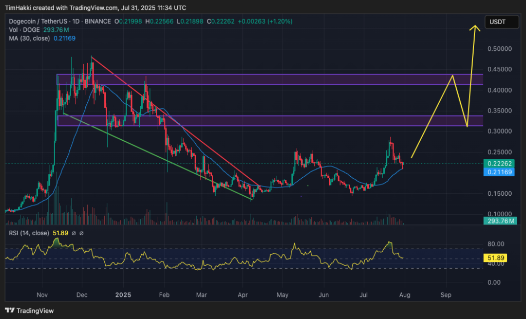 現在、DOGEの取引価格は約0.2227ドルで、過去1ヶ月で38%上昇し、この上昇後は安定しているようです。