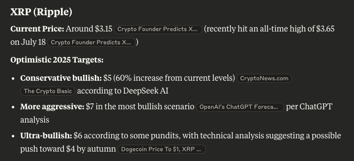 クロードは、XRPの価格が今年の年末までに7ドルに上昇する可能性があると考えており、現在の約3.16ドルの価値から121.5%の上昇となります。