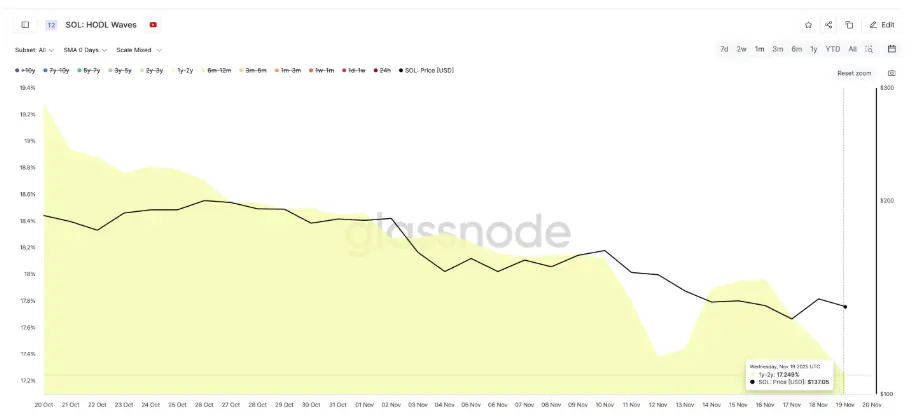 オンチェーンデータは、ソラナの長期保有者の間で信頼の低下が観察されていることを示しています。1-2年のコホートは供給を17.24%に減少させ、1ヶ月前の19.28%から下がりました。これは、このグループが現在の市場で蓄積しているのではなく、市場に分配していることを示しています。