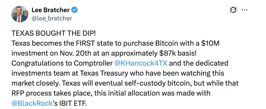 今日の未明、テキサス州ブロックチェーン協会の会長リー・ブラッチャーが、州が正式にビットコイン準備プログラムを開始し、最初の500万ドルのブラックロックビットコイン現物ETF(IBIT)の購入を完了したと発表しました。この瞬間、冷たい市場の感情は、氷が割れる清らかな音を聞いたかのようです。