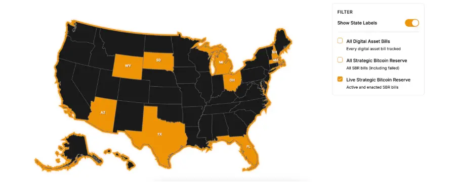 しかし、立法プロセスは順調ではありません。ほとんどの州は提案後に停滞し、一部の法案は撤回されたり、直接否決されたりし、本格的な段階に入るのはごくわずかです。Bitcoin Lawsの統計によれば、現在、アメリカ全体で州レベルのビットコイン準備法案を正式に通過させた州はわずか3つで、順番にアリゾナ州、ニューハンプシャー州、テキサス州です。上記の3州を除いて、現在SBR法案を進めているのはフロリダ州、サウスダコタ州、ワイオミング州、ミシガン州、オハイオ州、マサチューセッツ州だけです。