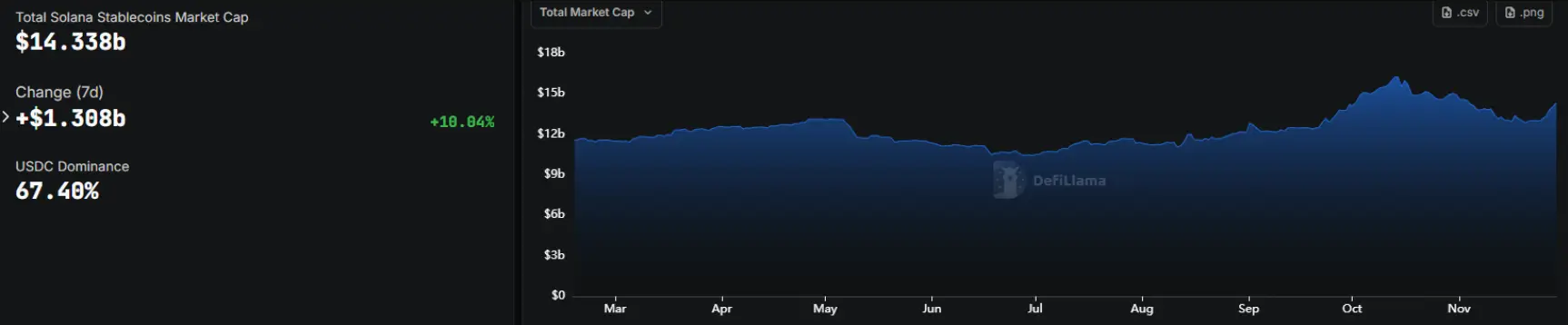オンチェーンデータはこの楽観的なシナリオを裏付けています。ソラナの流動性は急増しており、ステーブルコインの供給はわずか1週間で10%の増加を記録しました — 約13億ドルの新たな流動性に相当します — これにより、総供給は11月上旬のピークである143.3億ドルに戻りました。