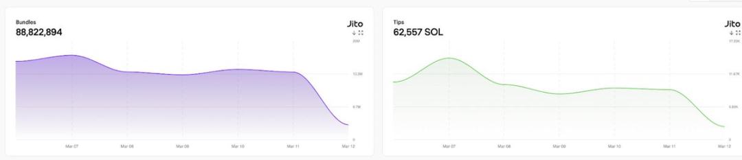 2025年3月10日、Jitoデータダッシュボードによると、Solanaチェーン上のBundle取引量とTipsがやや減少しており、一部のユーザーがSOL上のサンドイッチ攻撃の数が増加していると報告しています。この異常な現象は再びMEV問題を議論させています。
