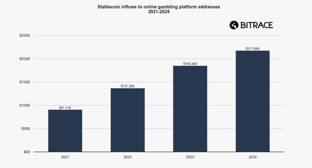 2024年はWeb3業界にとって、画期的な年となります。Cryptoの時価総額規模と業界インフラの採用度は前例のない高みに達し、その一方で犯罪産業もCryptoインフラを利用してそのビジネスを最適化したり、新しい犯罪のパラダイムを創出したりし始めています。本報告書は、主要な暗号犯罪タイプの規模を統計的に分析・開示し、コンプライアンス施設が犯罪産業の規模に与える影響を明らかにし、業界と政府に対して暗号犯罪による危害を重視するよう呼びかけます。篇幅の関係で、本稿では報告の一部の結論とデータのみを示します。完全版のダウンロードはBitraceの公式サイトをご覧ください。### 暗号化通貨の犯罪状況は依然として厳しい! [2024 Crypto Crime Yearbook: Fraud Emerges in an Endless Stream, Black and Grey Industry Transactions Remain Unquiated](https://img.gateio.im/social/moments-03230d8678be7d13f73650c43952feb7)```高リスクアドレスが受け取るステーブルコインの数量```リスクの高い活動は主にイーサリアムとTRONのネットワークで発生していることを考慮し、Bitraceは、違法なエンティティがステーブルコイン(ERC20\_usdt、ERC20\_usdc、TRC20\_usdt、TRC20\_usdc)をこれら2つのネットワークで受信、送信、保存するために使用するブロックチェーンアドレスを高リスクアドレスと定義し、過去2024年のそのような高リスクアドレスの総収集サイズは6,490億ドルに達し、前年よりわずかに増加しています。! [2024 Crypto Crime Yearbook:詐欺が際限なく出現し、ブラックとグレーの業界取引の規模は減少し続けています](https://img.gateio.im/social/moments-6d3997089f73378380b4016de9371272)```高リスク活動はステーブルコインの総取引規模の割合を占めています。```取引量に基づいて計算すると、この高リスク活動はその年のステーブルコインの総取引活動の5.14%を占め、2023年と比較して0.80%減少しましたが、2021年および2022年よりも依然として顕著に高いです。! [2024 Crypto Crime Yearbook: Fraud Emerges in an Endless Stream, and the Scale of Black and Gray Industry Transactions Is Untenated](https://img.gateio.im/social/moments-dd0ad55c0766f3cf830bdf30119fdb63)```高リスクアドレスが安定コインを受け取る分類```ステーブルコインの種類に基づいて計算すると、2021年から2024年にかけて、トロンネットワークのUSDTが最も主要なシェアを占めていました。しかし、2024年にはイーサリアムネットワークのUSDTとUSDCのシェアがいずれも増加しました。### オンラインギャンブルの規模が継続的に成長しています! [2024 Crypto Crime Yearbook:詐欺が際限なく出現し、ブラックとグレーの業界取引の規模は拡大し続けています](https://img.gateio.im/social/moments-28ed55fb40e8ed8adc56c70a1d619c23)```ギャンブルプラットフォームが安定通貨の数量を受け取る```2024年のオンラインギャンブルプラットフォームおよびそれに資金出入金サービスを提供する決済プラットフォームの資金規模は2178億ドルに達し、2023年の規模と比較して17.50%以上の増加となります。! [2024年暗号犯罪年鑑:詐欺は際限なく出現し、ブラックとグレーの業界取引の規模は衰えることはありません](https://img.gateio.im/social/moments-35cd6fdf98ff73718039647b14653f12)```ギャンブルプラットフォームのステーブルコインカテゴリ```オンラインギャンブルプラットフォームで使用されるステーブルコインの種類の統計によると、2024年のUSDCシェアの割合は大幅に増加し、13.36%に達し、2023年の5.22%よりもはるかに高くなっています。 これは、USDCの市場シェアが拡大するにつれて、準拠したエンティティによって発行および規制されているにもかかわらず、オンラインギャンブル分野での採用も大幅に増加したことを示しています。### 黒と灰の産業の取引規模は減少しない! [2024年暗号犯罪年鑑:詐欺が際限なく出現し、ブラックとグレーの業界取引の規模は拡大し続けています](https://img.gateio.im/social/moments-a73ecf16a85a9b059b5e49604339dfc8)```黒灰産取引アドレスが受け取るステーブルコインの数量```2024年のイーサリアムネットワークとトロンネットワークにおいて、ブラック・グレー産業に関連するビジネスアドレスが受け取った資金は2781億ドルを超え、2023年をわずかに上回りましたが、これら2年間の取引規模は2021年と2022年を大きく上回っています。ブラックおよびグレー産業の発展と切り離せないのは、暗号化通貨担保取引プラットフォームです。この種の機関は、犯罪者間で信頼を構築し、ブラックおよびグレー産業のすべての段階に担保サービスを提供することがほぼできます。! [2024 Crypto Crime Yearbook: Fraud Emerges in an Endless Streams, and the Scale of Black and Gray Industry Transactions Is Untensated](https://img.gateio.im/social/moments-e6e5826ce812025927ab60dcc3dac920)```好旺担保は安定コインの数量を受け取ります```好旺担保とその東南アジアの競合他社の台頭は、現地の実体経済活動におけるステーブルコインの普及とともに展開されており、この傾向は2024年に特に顕著であり、その年の第4四半期にはその業務規模が264億ドルに拡大しました。### 暗号化詐欺の規模が急激に増加しています!