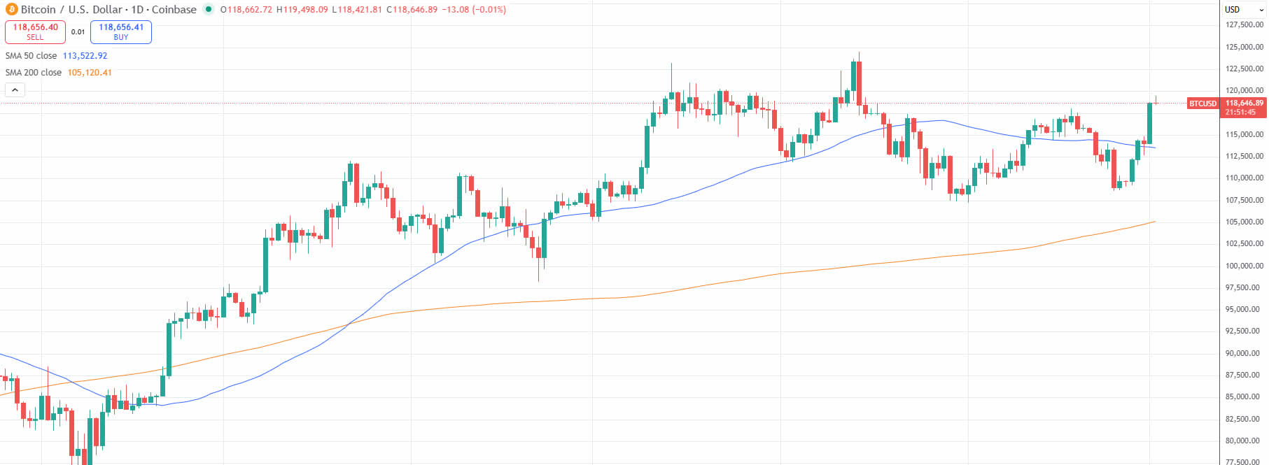 ビットコイン (BTC) の価格は、過去24時間で4%急騰し、世界の主要なデジタル資産が木曜日の早い取引で主要な取引所で119,450ドルに達したと、データソースによると。