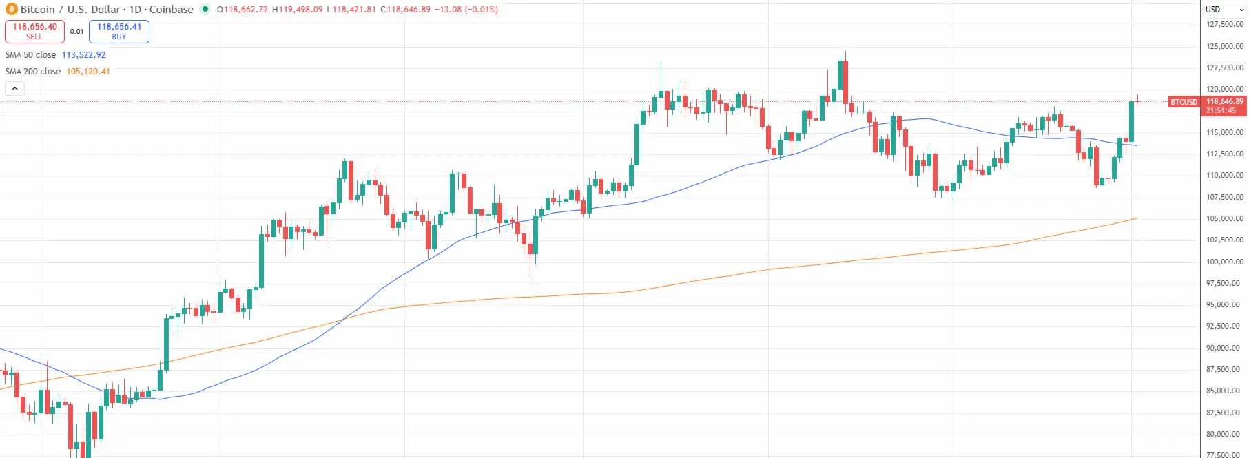ビットコインは現在、$117,500の抵抗を突破しましたが、$120,000のレベルで少し抵抗に直面しています。このレベルを超えると新たなピーク価格への道が開かれますが、若干冷却し、執筆時点で$118,947に後退しています。