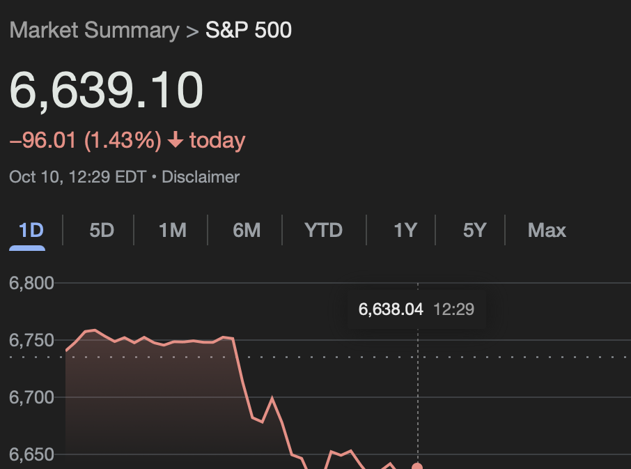 金曜日の正午までに、S&P 500は1.43%下落して6,639に達し、週のすべての利益を失いました。ナスダックは約2%下落し、ダウ・ジョーンズ工業株平均は1%失って、トランプのソーシャルメディアのコメントによって引き起こされた売りが続いています。彼は中国に対して「敵対的行動」を非難し、北京が希少金属やその他の重要な材料に対して輸出規制を課す準備をしていると主張しました。