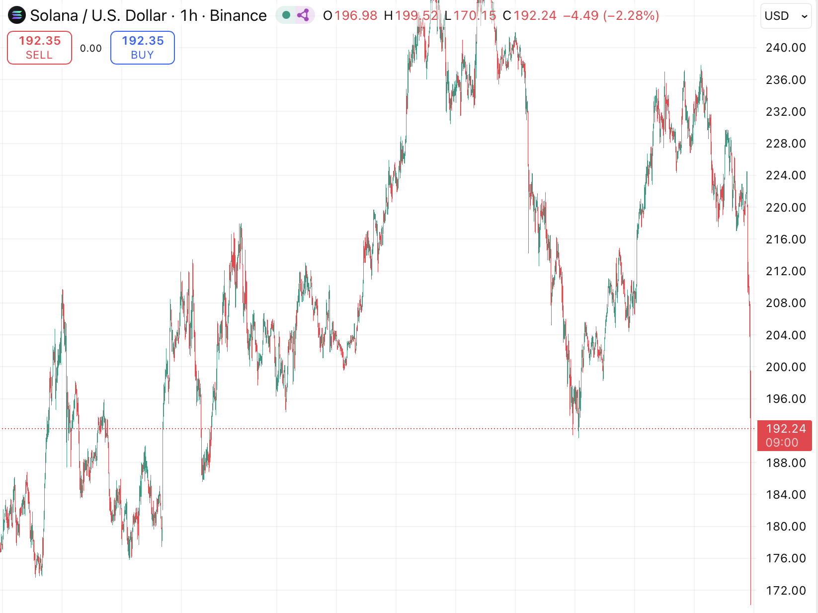ソラナ (SOL)は過去24時間で11.8%ドロップし、執筆時点では$192 付近で取引されています。暗号通貨市場全体が四半期の中で最も急激な売却の一つを経験しています。