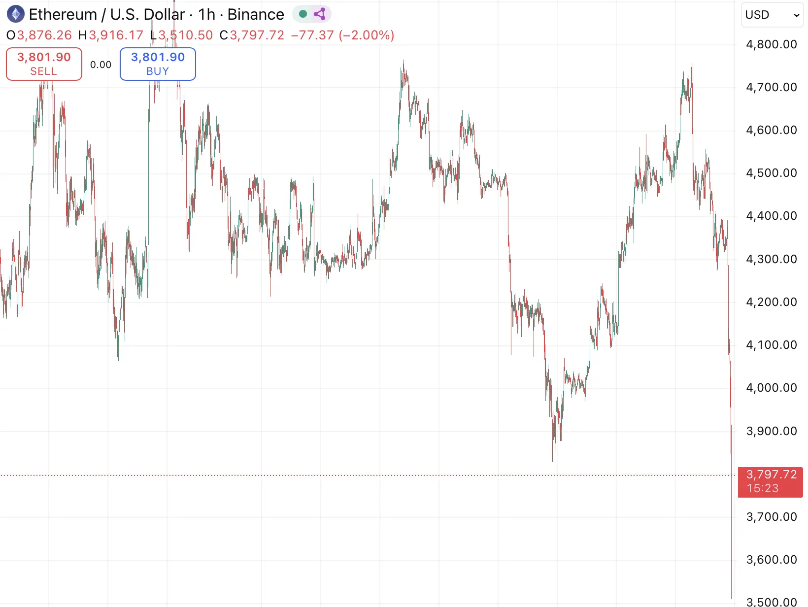イーサリアム (ETH)は、金曜日の遅くに広範な市場の売りに参加し、執筆時点でCoinMarketCapによると、24時間で13.7%急落し、約$3,797になりました。この動きは、暗号市場全体での清算の波の中で起こり、1日で$5 億ドル以上のレバレッジポジションが消失しました。