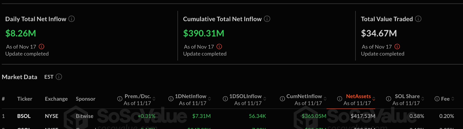 ソラナETFは依然として強い状態を保ち、月曜日に826万ドルを追加し、10月以降の総流入額を$390 百万ドルに押し上げました。