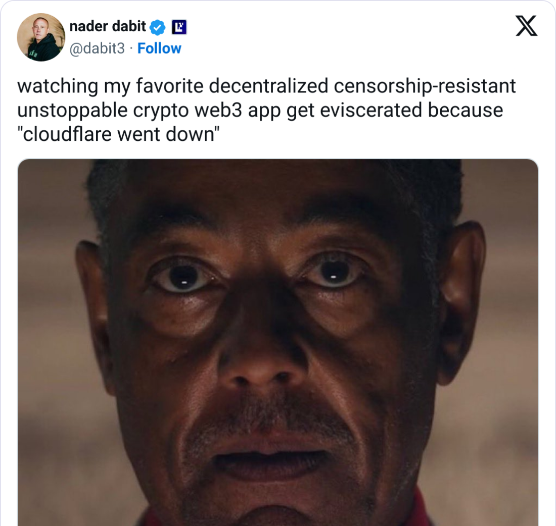 Cloudflareの障害がインターネットの20%をダウンさせ、暗号産業の中央集権的インフラへの依存を露呈