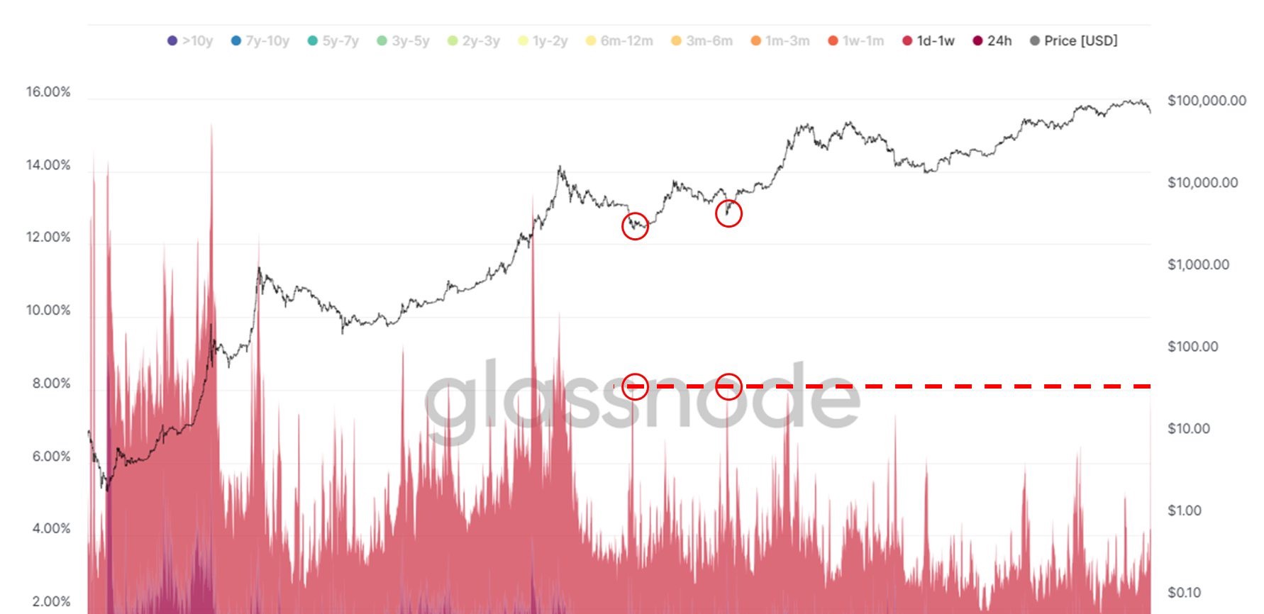 Glassnodeのオンチェーンデータによると、過去1週間で全ビットコインの8%以上が移動しました。