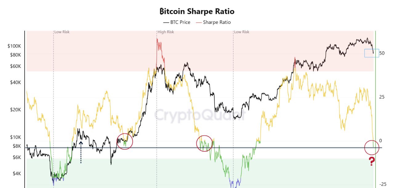 ビットコインのシャープレシオは「歴史的に最大の不確実性の瞬間とリスクの再評価の初期段階に関連付けられている水準にある」とCryptoQuantのアナリストI. モレノは月曜日に述べた。
