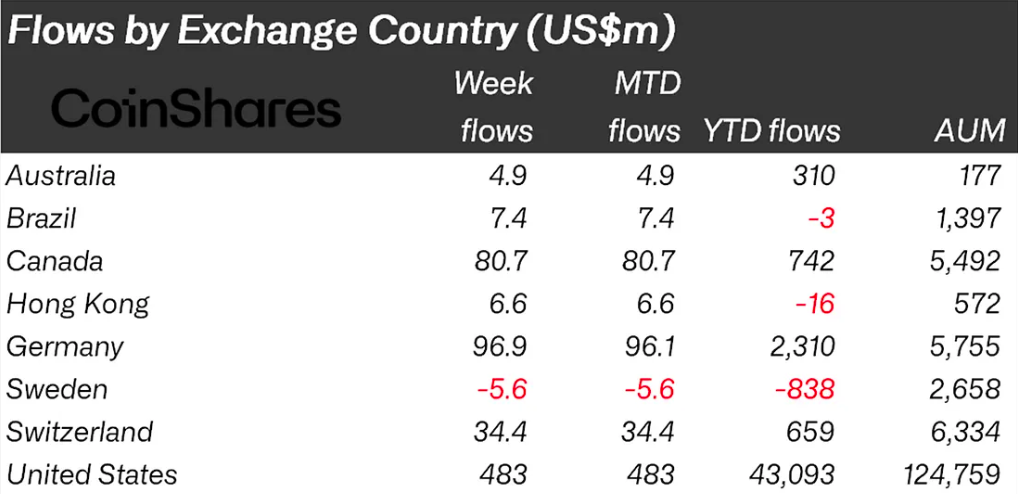 全体として、運用資産総額は11月の最安値から7.9%増加し、1800億米ドルに達しましたが、過去最高の2640億米ドルには依然及びません。米国、ドイツ、カナダでは、それぞれ4億8300万米ドル、9690万米ドル、8070万米ドルの資金流入が暗号資産ファンドで記録されました。
