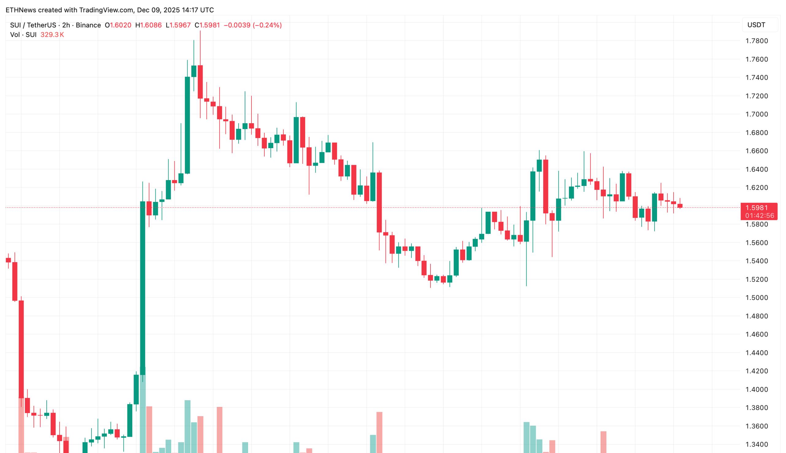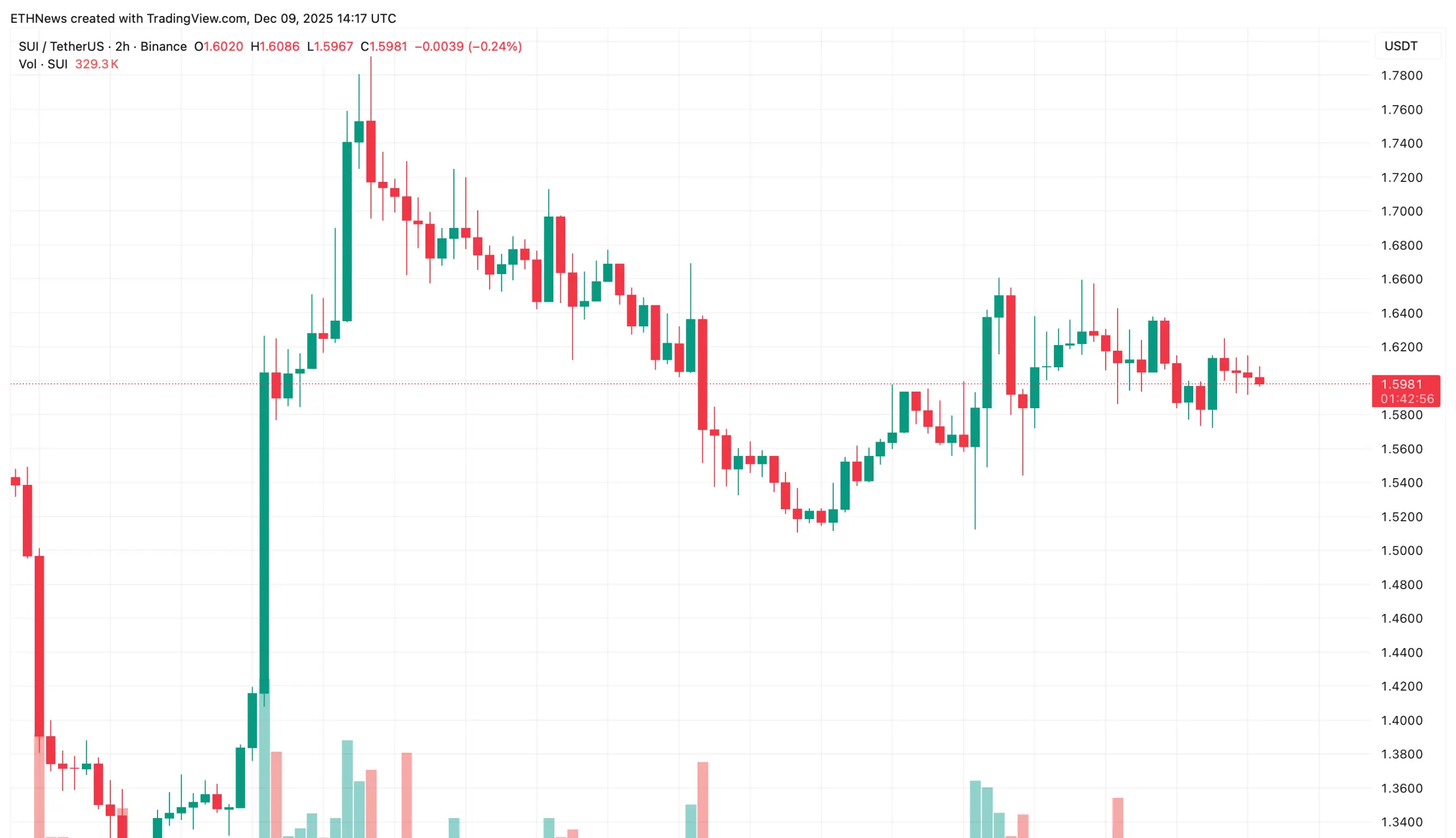 短期の2時間足チャートでは、SUIが激しい値動きの後にコンソリデーション(もみ合い)に入っていることがわかります。今週初めに$1.60を急反発で上抜けた後、市場は$1.58~$1.63の狭いレンジに落ち着いています。