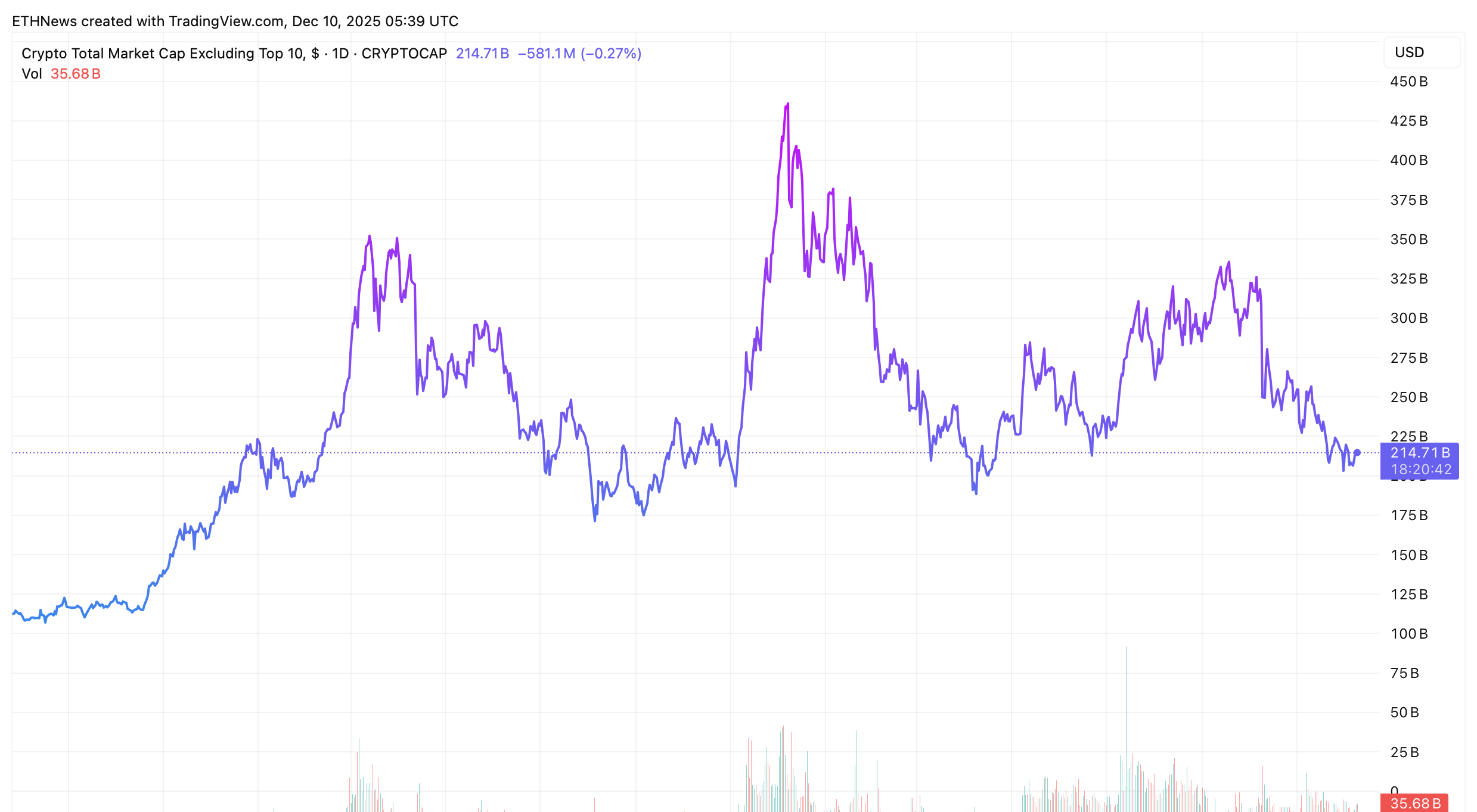 トップ10を除くアルトコインの総時価総額のTradingViewチャートもほぼ同じパターンを示しています。2024年初頭と2024年末のピークの後、深い修正波が続きましたが、そのたびに市場はV字型の反転を形成し、その後再び上昇チャネルへと上昇しました。