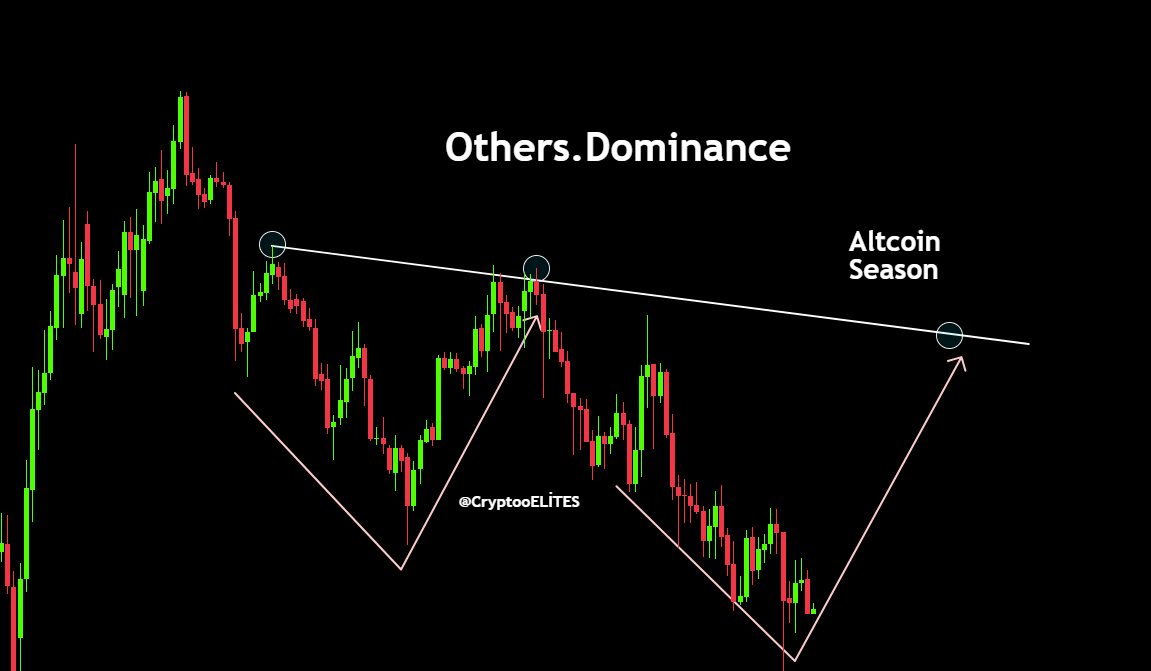 出典:ETHNews元のタイトル:アルトコイン市場はおなじみのパターンを浮かべ、支配的なチャートが再び歴史的なトレンドラインに到達元のリンク:より広範なアルトコイン市場は、転換点に近づいているかもしれません。トップ10以外のすべての暗号通貨の市場シェアを追跡する「Others Dominance」チャートの繰り返し構造が、歴史的に主要なアルトコインのラリーに先立ってあったリズムを再び形成しています。トップ10以外の総時価総額が約2147億ドルにのぼる中、トレーダーは次のローテーションがすでに形を成し始めている兆候に注目しています。## アルトコインのシーズンを予測し続ける長期トレンドラインCryptoElitesは支配チャートに顕著なパターンを示しています。各主要な底が一貫して価格を同じ下降トレンドラインへと導いています。この線のこれまでのあらゆる接触は、アルトコインのシーズンとほぼ完璧に一致しており、資本がビットコインやブルーチップ資産から中型・小型株トークンへと積極的にローテーションしていました。現在の構造はその歴史的なリズムを反映しています。再び鋭い底が形成され、その後回復が続き、次の試練となるトレンドラインに向かっているようです。このリズムが維持されれば、アルトコインはまもなく次の強力な拡大フェーズに入る可能性があります。## 時価総額データは同じ景気循環の動きを示していますトップ10を除くアルトコインの総時価総額のTradingViewチャートもほぼ同じパターンを示しています。2024年初頭と2024年末のピークの後、深い修正波が続きましたが、そのたびに市場はV字型の反転を形成し、その後再び上昇チャネルへと上昇しました。今日のチャートは再び同じ収縮期がゆっくりとした回復へと移行していることを示しています。時価総額は依然として約2億1,400万ドルですが、この調整構造は急激な上昇前の過去の期間に似ています。## なぜこの構造がトレーダーにとって重要なのか繰り返されるチャートパターンは保証ではありませんが、市場のポジショニングを示す重要なシグナルとなります。現在のパターンを反映した過去の瞬間は、投機的なアルトコインへの資本回転の初期段階を示していました。もし価格が再び長期トレンドラインに近づけば、現在の軌道が示すように、歴史的にボラティリティの高まり、流動性の流入、そして小型株間での強い相対的なパフォーマンスと相応するでしょう。## 次に何が来るのかCryptoElitesは、これは予測ではなく、チャート上で繰り返されている同じ構造的な動きだと強調しています。それでも、リズム、トレンドラインのポジショニング、マクロ時価総額構造の組み合わせが、トレーダーがほとんど無視できないセットアップを作り出しています。もし支配チャートが再びトレンドラインに達しれば、最近の経緯はアルトコイン市場が再び強力な拡大サイクルを迎える可能性を示唆しています。