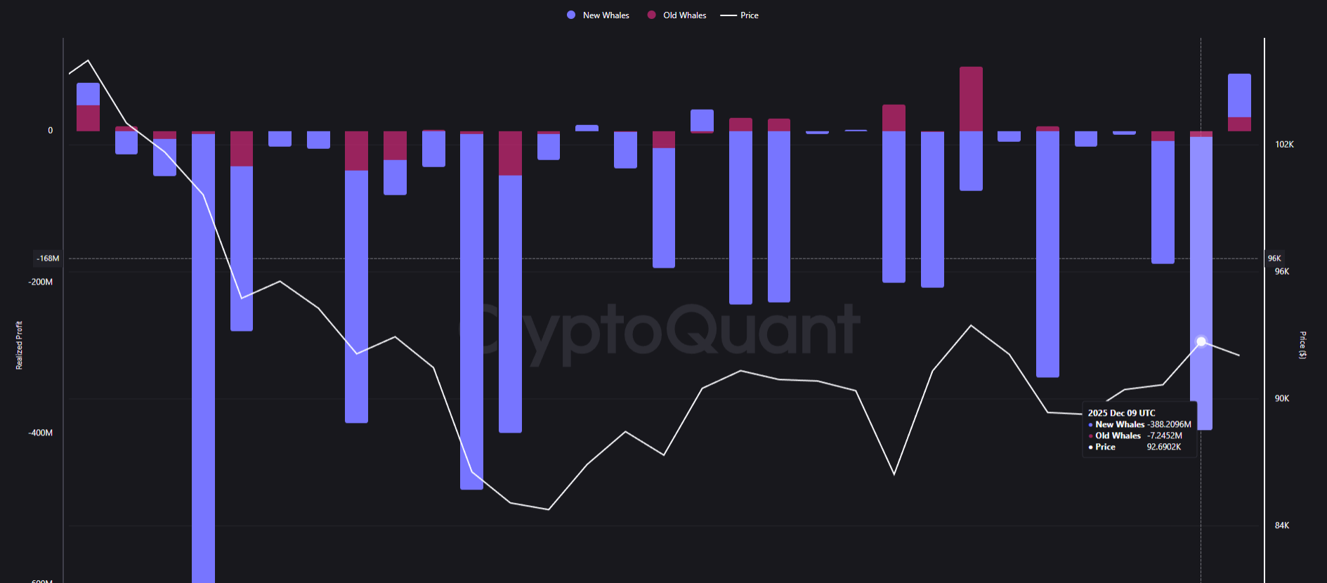 ソース:CryptoNewsNetオリジナルタイトル:4 Charts Explain Bitcoin’s Price Condition Heading into Christmas 2025オリジナルリンク:ビットコインは2025年クリスマスに向けて脆弱ながらも興味深い位置にあります。数週間の圧力の後、価格は約93,000ドル付近で推移しています。4つの重要なチャートは、市場が修正の遅れを示しているものの、明確な強気の引き金にはまだ欠けていることを示しています。このデータは、3つの大きな力が働いていることを強調しています。最近の買い手は大きな損失を抱えており、新たなホエールは投げ出しています。マクロ環境は依然として価格を左右しており、スポット買いの勢いは静かに戻りつつあります。## 短期ビットコイン保有者は深刻な痛みを抱える最初のチャートは**短期保有者 (STH) の実現利益と損失**を追跡します。このグループには最近数ヶ月で購入されたコインが含まれます。彼らの「実現価格」は、これらのコインの平均コスト基準です。2025年初頭、短期保有者は大きな利益を得ていました。ビットコインが上昇するにつれて、平均ポジションは15-20%の利益を出していました。その期間は利益確定を促し、最高値付近で売却圧力を増加させました。しかし、今日の状況は逆です。ビットコインは**実現価格より下**で取引されており、そのグループは約**-10%**の損失を示しています。チャートのヒストグラムは赤色で、2025年の最も深い損失の一つを示しています。これは2つの結果をもたらします。短期的には、これらの水中にいる保有者はすべての反発に売りに出ることができます。多くは単に損益分岐点で売却したいだけで、これが彼らのエントリーゾーンに向けた反発を制限します。しかし、深く持続的な損失のポケットは通常**修正の後半**に現れます。これらは、弱い手がすでに大きなダメージを受けていることを示しています。いずれかの時点で、このグループの売り圧力は低下します。短期保有者のコインの75%は損失を抱えており、(4.36百万BTC)を超えています。興味深いことに、これはこのビットコインサイクルの前の2つのローカルボトムと類似しています。歴史的に、重要な転換シグナルは、価格が**下から短期保有者の実現価格を回復**したときに現れます。その動きは、強制的な売却がほぼ完了し、新たな需要が供給を吸収し始めていることを示しています。それまでは、チャートは依然として警戒と現在のレベル周辺でのレンジ取引を示唆しています。## 新たなビットコインホエールは降参した2つ目のチャートは**ホエールグループ別の実現利益と損失**を示しています。これは、「新しいホエール」と「古いホエール」にフローを分割します。新しいホエールは最近大量に保有を積み上げた大口保有者です。昨日、新しいホエールは1日で**$386 百万の損失**を実現しました。チャートの棒は大きなマイナスのスパイクです。いくつかの他の大きなマイナス棒も最近の安値付近に集中しています。古いホエールは異なる物語を語ります。彼らの実現損益は小さく、よりバランスが取れています。彼らは新参者と同じペースで退出していません。このパターンは修正の後期段階で典型的です。新しいホエールはしばしば遅れて買い、レバレッジや強いナarrativeバイアスを伴うこともあります。価格が逆方向に動くと、彼らは最初に投げ出します。その投げ出しには構造的な利点があります。コインは弱い大口から強い手や小規模な買い手へと移動します。このようなイベントの後、将来の売り圧力は減少します。短期的には、これらの強制売却は価格をさらに下げる可能性があります。しかし、中期的には、これらはビットコインの保有者層の質を向上させます。パニックに陥った大きな売り手が退出を終えると、市場はより回復力を持つようになります。## 実質金利は依然としてビットコインを動かしている3つ目のチャートは、ビットコインと**2年米国実質金利**を逆転させて重ねたものです。実質金利はインフレ後の金利を測定します。このシリーズは2025年を通じてほぼティックごとに動き、BTCと連動しています。実質金利が**下落**すると、逆のラインは上昇します。ビットコインは流動性の改善とともに上昇傾向を示すことが多いです。低い実質金利は、安全資産に対してリスク資産をより魅力的にします。夏以降、実質金利は再び上昇に動きました。逆のラインは下降し、ビットコインもそれに従いました。これはマクロ環境が依然として大きなトレンドを支配していることを示しています。連邦準備制度の利下げだけではこれを解決できません。重要なのは、市場が**実質**借入コストの推移をどう見込むかです。インフレ期待が名目金利よりも速く低下すれば、実質金利は上昇する可能性もあります。ビットコインにとって、持続的な新しい強気トレンドは**より緩やかな実質環境**を必要とするでしょう。そのシフトを織り込むまでは、BTCの上昇にはマクロの逆風が続きます。## スポ