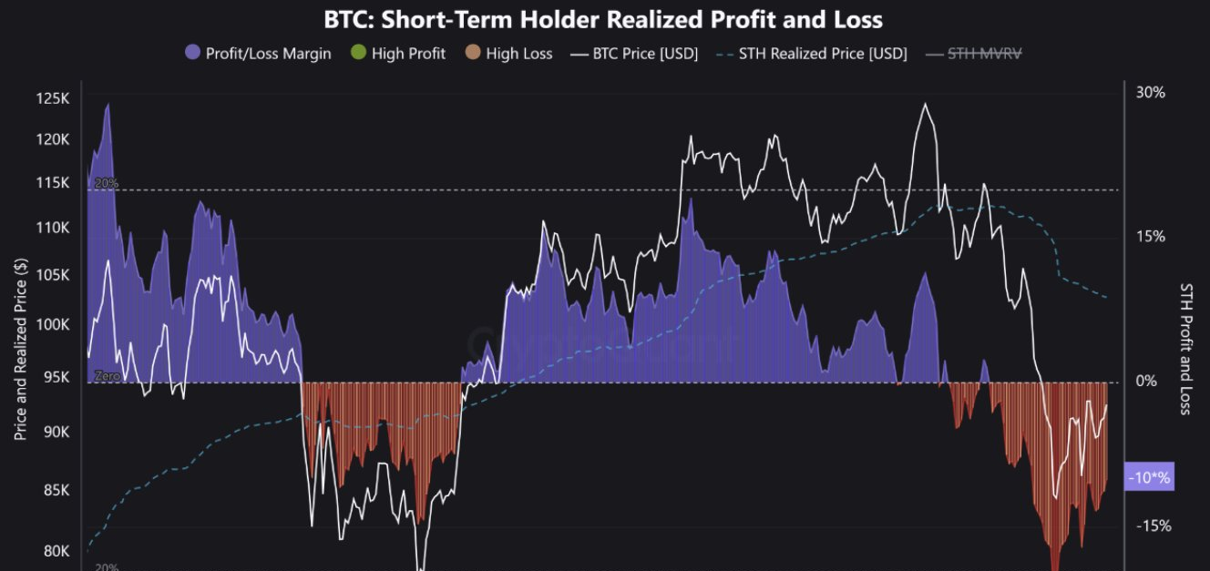 歴史的に、重要な転換シグナルは、価格が下から短期保有者の実現価格を回復したときに現れます。その動きは、強制的な売却がほぼ完了し、新たな需要が供給を吸収し始めていることを示しています。