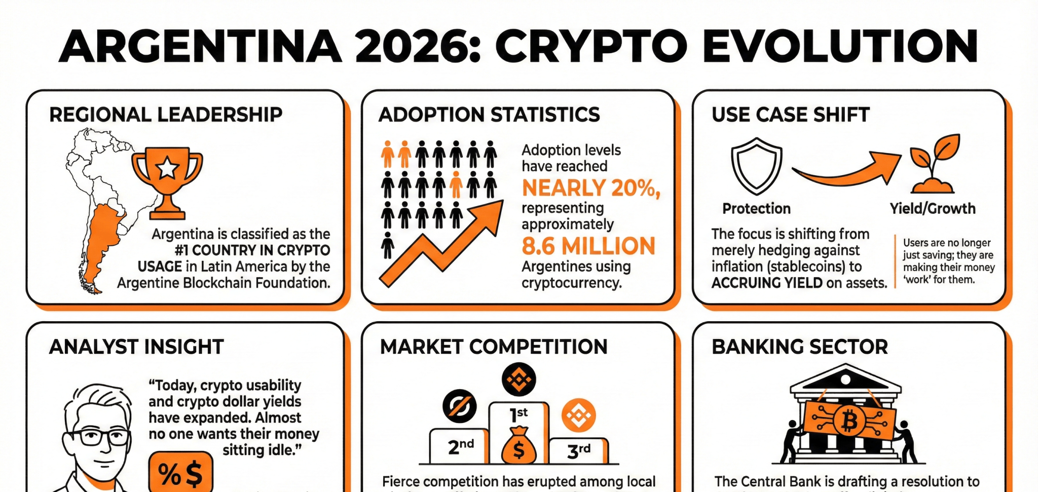 ソース:CryptoNewsNetオリジナルタイトル:アルゼンチン、2026年に暗号通貨普及率20%に到達オリジナルリンク:アルゼンチンの暗号通貨エコシステムは、2026年も進化を続ける見込みであり、アナリストや業界関係者は、国内での暗号通貨のユースケースも変化していると述べている。アルゼンチンは、新年を迎えるにあたり高い暗号通貨普及率を記録しており、アルゼンチン・ブロックチェーン財団によってラテンアメリカで最も暗号通貨の利用が進んでいる国と分類されている。最新の報告書によると、ブロックチェーンデータ企業のChainalysisは普及率をほぼ20%と報告しており、数字は増加傾向にある。これは、860万人のアルゼンチン人が何らかの暗号通貨を保有または使用していることを意味し、デジタル資産の採用が最も進んでいる国の一つに位置付けられている。当初、アルゼンチン人のユースケースはインフレや法定通貨の価値下落に対抗する手段としてステーブルコインを利用することだったが、これも変化しつつある。報告書によると、依然としてステーブルコインは国内で事実上の標準的なデジタル資産としてヘッジ手段として使われているが、ユーザーはこれらを活用し、ステーブルコインの保有による利回りを得るようになっている。現地アナリストのロドリゴ・マンシージャは述べている:> 今日では、暗号通貨の利便性、暗号ドルの利回り、その他の魅力的な機能が大幅に拡大している。ほとんど誰も資金を放置して「働かせて」おきたくない。これにより、業界内の地元プレイヤー間で激しい競争が生まれ、より高い利回りを提供してユーザーファンドを引きつけようとしている。銀行がこのエコシステムに参入することも競争を激化させるだろう。報告によると、中央銀行は現在、銀行がデジタル資産サービスを提供できるようにする草案を検討している。## よくある質問**アルゼンチンのラテンアメリカにおける暗号通貨普及率はどの程度ですか?**アルゼンチンは、ラテンアメリカで最も暗号通貨の利用が進んでいる国とされており、普及率はほぼ20%です。**アルゼンチン人の何人が暗号通貨を使用していますか?**約860万人のアルゼンチン人が現在暗号通貨を使用しているか、過去に使用したことがあり、世界のトップ採用国の一つに位置付けられています。**2026年のアルゼンチン人のステーブルコインの利用状況はどうなっていますか?**当初はインフレ対策として使われていたが、現在は利回りを得るためや保有資産の有効活用のためにステーブルコインを活用している。**銀行の暗号エコシステム参入による潜在的な変化は何ですか?**アルゼンチン中央銀行は、銀行がデジタル資産サービスを提供できるようにするための決議案を策定中であり、これによりユーザーファンドを巡る競争が激化する見込みです。
