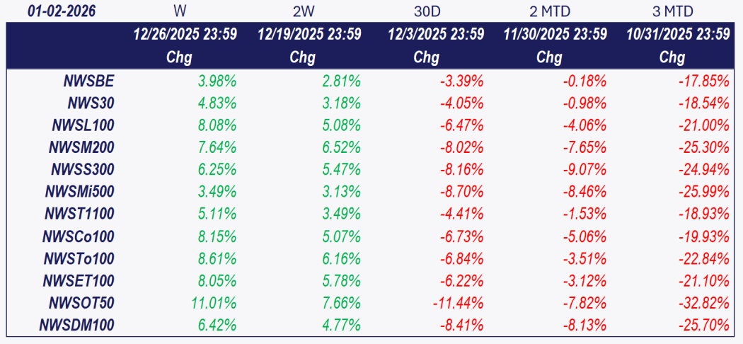 NWST1100は強力な週間反発を示し、重要な点として、モメンタムと幅がともに動きました:RSIは約60ゾーンに入り、PPOヒストグラムはプラスに転じ、ADVPLとMcClellanも改善し、主要セグメントのA50Rは26–35%の範囲に跳ね上がりました。価格構造も1月2日に改善しましたが、再び平均回帰のもみ合いに戻らないようフォローが必要です。週末までに、市場のトーンは「ラリー売り」から「ディップ買い (選択的に)」へと変化しましたが、全体の文脈は依然として:これはより広範な修正構造内の回復試行であり、リスク管理が引き続き重要です。
