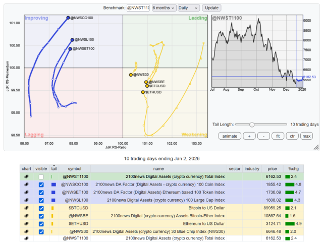 ✔ ビットコイン、イーサリアム、NWS30、NWSBEは、相対的な強さは高いままですが、モメンタムは衰え始めていることを示す「弱化」象限に入りました。