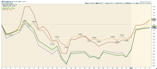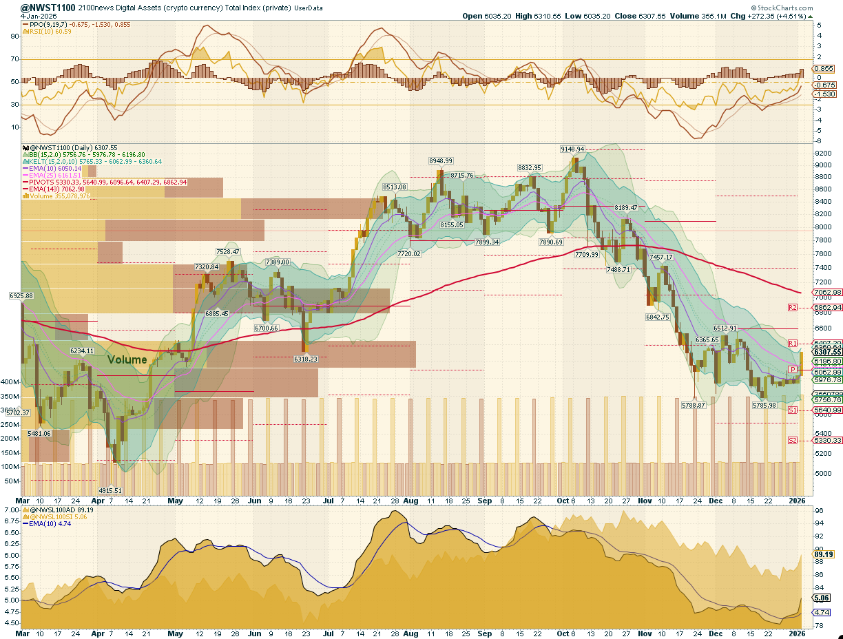 **NWST1100指数は先週5.18%上昇しました。大規模なEthereumベースのトークンであるChilliz (CHZ)は、二週間ごとのNWSL100暗号資産指数内で順位を最も大きく上げました。***\*以下に、インテリジェントファイナンスの理論スイングタムに基づいて作成された標準化された週間レポートと来週の展望を示します。私たちは、2100NEWSデジタル資産総合指数 (NWST1100)を用いて暗号市場の幅と方向性を測定します。これは、市場資本額に基づく重要な暗号資産1100のパフォーマンスを示しています。情報量の多いチャートは最初は読みづらいですが、価格の重要な情報、主要な意思決定レベル、モメンタム、取引量、暗号市場の幅を効果的に表示します。**市場のセンチメントと幅の監視は、トレンド反転や継続的な強さの早期兆候を検出するために必要です。** **🔁 年間レビュー:2025年の暗号市場これは2026年最初の週間レポートです。現在の市場状況に移る前に、2025年の暗号市場のダイナミクスを簡単に振り返ることは有益です。2025年は、大規模な資本流入とマイナスリターンによって定義された年であり、構造的成熟によるものではありませんでした。より深い機関投資の関与と暗号関連ETFの継続的な発展にもかかわらず、市場はより安定しませんでした。むしろ、資本流入と流出の規模が拡大し、暗号エコシステムの深さが限定的なままであったため、価格変動が増幅されました。2025年のボラティリティは、投機的熱狂の結果ではなく、資本流の規模と市場の吸収能力の不均衡の結果でした。成熟への移行を示すのではなく、2025年はレジームイヤーであり、パッシブエクスポージャーやナarrative駆動のポジショニングを罰しました。年間を通じて、ビットコイン、イーサリアム、そして広範なNWST1100デジタル資産指数はすべてマイナスで終わりました。暗号市場は伝統的な資本市場を大きく下回り、NWST1100はダウ・ジョーンズ・ワールド指数 (DJW) によると、世界株式の約3分の1の価値を失いました。構造的に見ると、過去12か月の平均NWST1100指数レベルは約7,146ポイントであり、年中最も長く滞在した価格帯を反映しています。ボリュームプロファイルは重要な背景を提供し、取引活動が3つの支配的な値域:5,800–6,400ポイント、6,800–7,400ポイント、7,800–8,400ポイントに集中していたことを示しています。これらのゾーンは、市場の主要な受け入れと拒否レベルを定義します。ドローダウンは明確な構造的階層に従いました。ベータが高く、市場資本額が小さいほど、損失は深くなります。時価総額上位30外の資産は体系的にパフォーマンスが低く、Ethereumベースのトークンは特に深刻な損失を被り、平均して価値の半分程度にまで落ち込みました。市場の幅は罰せられ、流動性は最も重要で防御的なセグメントに集中しました。売却が激化した局面、特に年の最終四半期では、ベータの低いエクスポージャーは比較的良好に振る舞いました。相対回転グラフ (RRG) は、ビットコインとビットコイン重視の指数が下落幅を抑え、より小型のセグメントが大きく下落したことを確認しています。12か月の視野では、NWSBEとNWS30が最も相対的に堅調でした。年末に向けて、イーサリアムは相対的な改善の兆しを見せ始めました。同時に、ビットコインは遅れをとり続けており、これは長期的な修正サイクルの後期段階に一致するパターンです。要約すると、2025年は暗号の成熟の年ではなく、ベータ意識、レジーム管理、ダイナミックアロケーションを報いる年でした。市場は安定性を通じて基盤を築くのではなく、構造をストレステストし、広範な回復ではなく選択的な機会の舞台を整えました。NWST1100チャートと関連市場指標の詳細な分析は、現在の市場状況に関する重要な洞察を明らかにします。過去一週間で、NWST1100指数は5.11%上昇し、長期の修正フェーズの後に決定的な改善を示しました。価格動向は3つの明確な段階に展開しました。最初は急激な反発、その後不安定さと失敗した追随、これは年末の薄い流動性の特徴です。次に、狭い調整と平均回帰フェーズに入り、回帰チャネルの中間ゾーン周辺でリーダーシップが回転しましたが、モメンタムの拡大には至りませんでした。週の終わりには、インデックスが中間チャネルと短期移動平均線を超え、構造的な変化を示す上昇加速が見られました。価格構造の観点から、反発はもはや反射的な跳ね返りにとどまりません。インデックスは10日と25日のEMAを回復し、ケルトナーの中間帯に戻り、12月を支配した安値のシーケンスを無効にしました。長期的な下降構造は完全には中和されていませんが、最近の上昇は、確認された高値・安値の形成を示し、別のブル・トラップシナリオではありません。1. 市場センチメント:モメンタム指標はこの移行を確認しています。PPOヒストグラムは上昇を続けており、下落モメンタムの持続的な減速を示しています。ただし、PPOラインはマイナス圏から上昇し、ゼロラインに近