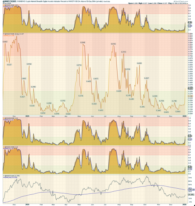 右側のチャートに示されているように、すべての主要セグメント (NWST1100, NWSET100, NWSL100, NWSCo100) のA50R値 — 50日EMAを超えて取引されている資産の割合 — は急激に改善し、「一桁」ではなくなっています。コイン (NWSCo100) コホートは最も弱く、構成銘柄のうち50日平均を超えるのはわずか26%です。これは「健全なブル市場」の兆候ではありませんが、降伏から再エンゲージメントへの明確なシフトを示しており、コインは回復のインパルスに遅れています。