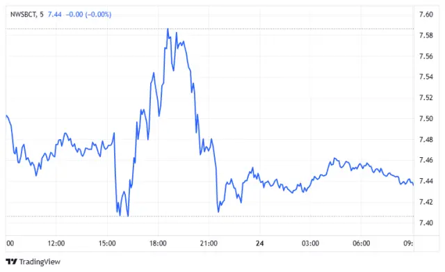 NWSBCT (ブルーチップ指数): NWSBCT指数は、極端なボラティリティから現在の安定段階への移行を示しています。昨日の夕方、7.59の抵抗レベルからの激しいリジェクションと、その後の7.41の流動性ゾーンへの急落の後、指数は夜間の時間をかけて底を固めました。現在は7.44付近で振動しており、即時のテクニカルサポートは7.42-7.43ゾーンでしっかりと維持されています。前回のセッションの高値に戻すことができないことは、参加者が「様子見」の姿勢を取っていることを示しています。