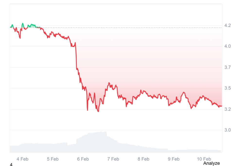 2026年2月10日、$4.2超からの下落後、強気派は$3.25-$3.30付近で抵抗を見せています。