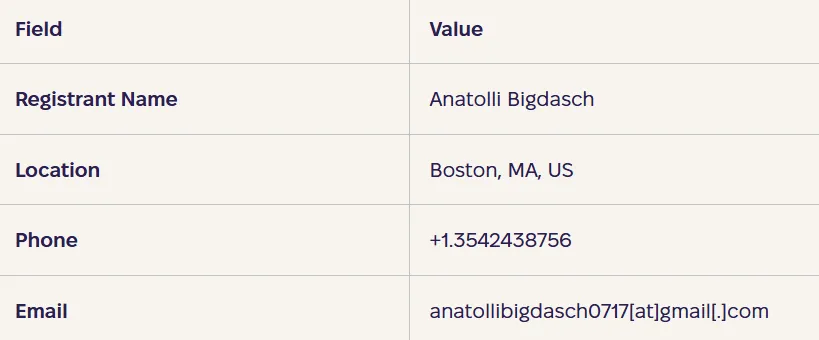 偽サイトのアドレスは、米国ボストンのアナトリー・ビグダシュ名義で登録されています。専門家はこの人物の実在性に疑問を持っています。