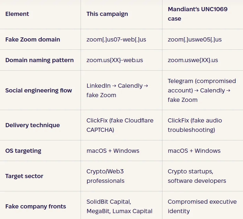 # ハッカーがベンチャー投資家を装い暗号通貨専門家を攻撃Moonlock Labのアナリストは、Web3開発者や暗号通貨専門家への大規模な攻撃を明らかにしました。ハッカーはベンチャー投資家を装い、LinkedInで犠牲者を見つけます。悪意のある者は専門家のプロジェクトを称賛し、協力を提案します。その後、偽のビデオ会議へのリンクを送り込み、コンピュータにウイルスを感染させます。## 正規ビジネスの幻想攻撃者は3つの架空の暗号資産ファンドを作成しました:SolidBit Capital、MegaBit、Lumax Capital。これらの組織のウェブサイトは信頼できるように見えます。そこには企業の歴史、投資ポートフォリオ、経営陣のリストが記載されています。社員の顔写真はニューラルネットワークによって生成されたものです。出典:Moonlock Lab。詐欺師はフェイクアカウントから専門家に連絡を取ります。彼らはこれらのファンドのトップマネージャーを名乗ります。会話は被害者の専門的な功績への賛辞から始まります。## ClickFixによる感染悪意のある者は迅速にやり取りをメッセンジャーに移し、ビデオ通話に招待します。犠牲者はCalendlyのリンクを受け取ります。そのリンクはZoomやGoogle Meetなどの正確なコピーサイトへリダイレクトされます。画面にはCloudflareの検証ウィンドウが表示されます。システムはチェックボックスにチェックを入れ、「ロボットではない」ことを確認させます。これがハッカーの技術「ClickFix」です。ボタンをクリックすると、悪意のあるコードがさりげなくクリップボードにコピーされます。サイトはタイマー付きのアニメーション付き指示を表示します。ユーザーはシステムターミナルを開き、コピーしたテキストを貼り付けてEnterを押すよう求められます。コードは自動的にOSを認識します:* **Windowsの場合**:メモリ内で直接隠されたプロセスを起動します。ウイルスはハードディスクにファイルを保存しないため、セキュリティシステムを回避できます。* **macOSの場合**:スクリプトはPythonの有無を確認し、必要なライブラリを密かにダウンロードし、システムに根付かせます。出典:Moonlock Lab。一部のケースでは、ハッカーはMac上の本物のZoomのインターフェースを完全にコピーしたアプリケーションを犠牲者に送信しました。このプログラムは認証ウィンドウを模倣し、パスワードを収集して詐欺師のTelegramボットに送信します。## 北朝鮮ハッカーとの関係偽サイトのアドレスは、米国ボストンのアナトリー・ビグダシュ名義で登録されています。専門家はこの人物の実在性に疑問を持っています。出典:Moonlock Lab。調査者は、UNC1069グループの手法と一致する点に気づきました。このグループは2018年から暗号プロジェクトをハッキングしています。Mandiantの分析者は以前、このグループを北朝鮮と関連付けていました。犯罪者は同じ構造の悪意のあるリンクや、フェイクビデオ通話を使った詐欺シナリオを採用しています。攻撃から身を守るために、専門家は相手のドメイン登録日を確認することを推奨します。正規のサービスは、本人確認や配信開始のためにコマンド入力を求めることはありません。外部リンクをクリックした段階で不審に気付くことができます。なお、2025年6月には、ベンチャー企業Hypersphereの投資パートナー、メフディ・ファルークが、偽のZoom通話を通じたフィッシング攻撃の被害に遭いました。