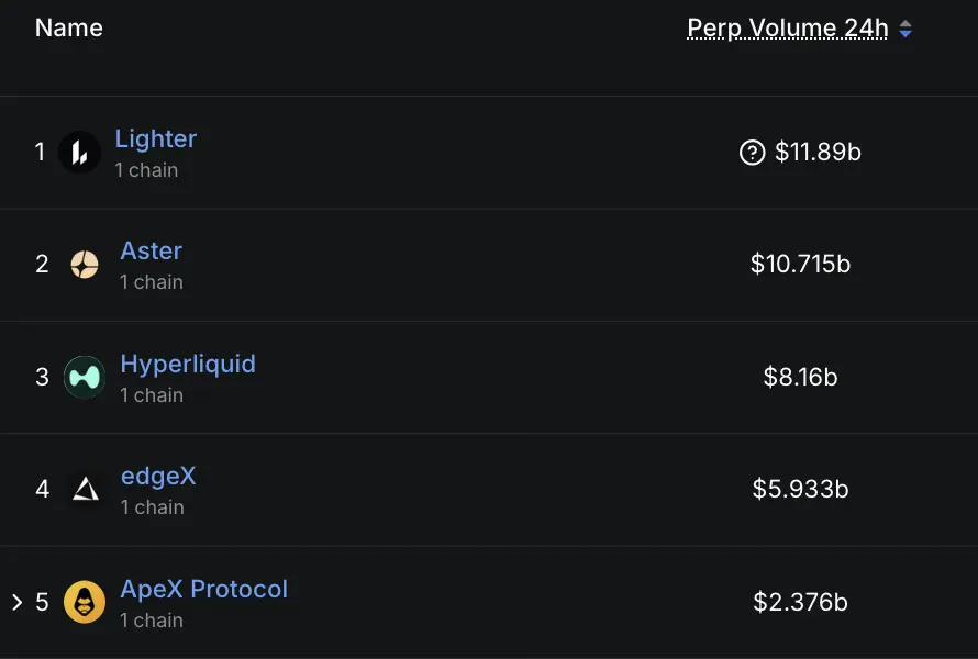 The decentralized derivatives trading platform (perp DEX) Lighter has topped the leaderboard with a trading volume of 11.89 billion USD in the last 24 hours, followed by Aster (10.72 billion USD) and Hyperliquid (8.16 billion USD).