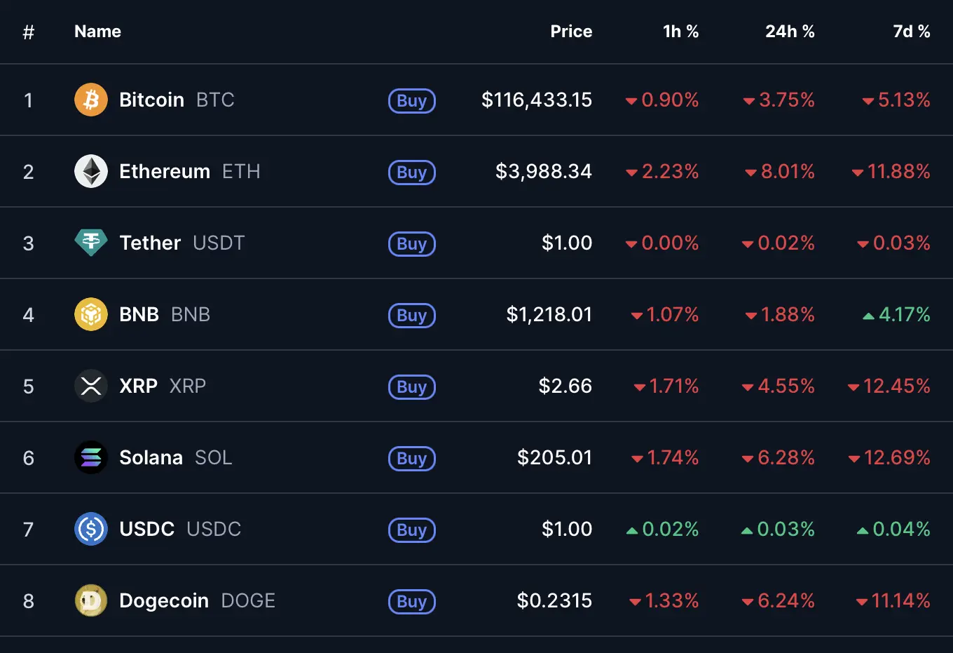 BTC Falls Below $117,000 and ETH Slips Under $4,000: What Happened to the Top 10 Cryptos
