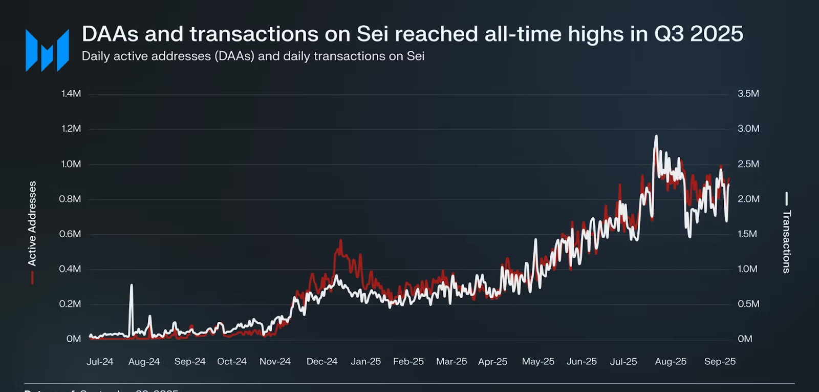 Seiは2025年第3四半期に5期連続のネットワーク成長を記録した。Messariのデータによると、平均日次アクティブアドレス数は前四半期比93.5%増の824,000に達し、日次取引数は87.1%増の約200万に上った。