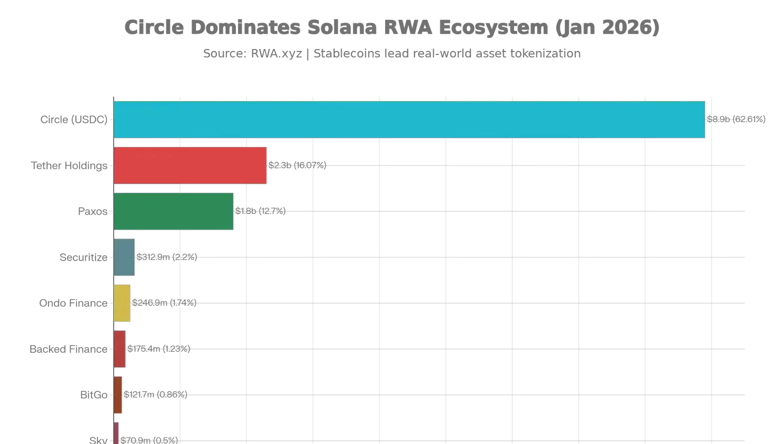 The Solana RWA ecosystem shows concentration among stablecoin issuers and yield-bearing treasury products. Circle’s USDC ecosystem totals $8.9 billion, accounting for 62.61% of all Solana-tracked RWAs. Tether Holdings contributes $2.3 billion (16.07%) while Paxos adds $1.8 billion (12.70%). Combined, stablecoin platforms comprise approximately 91% of tracked value.