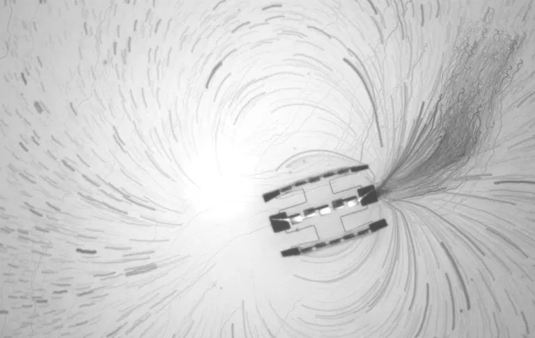 三つのモーターが連結されたロボットの近くの粒子追跡軌跡をタイムラプスで投影した一連の画像。