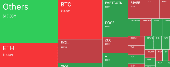 CoinGlassのデータによると、過去24時間でビットコイン市場の約1235万ドル規模のポジションが清算され、そのうち約53.9%が空売りポジションだった。全デジタル資産市場の過去24時間の清算規模は1億467万ドルに達した。