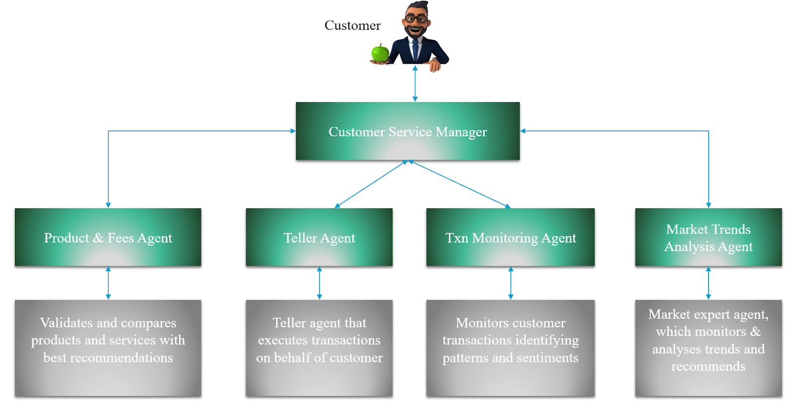 All these agents perform their tasks concurrently and report to the manager agent, who in intern responds to customer queries. Curated domain knowledge and training makes these agents an expert in their area. The vast organizational library of wealth management research and data points are resources, which can be leveraged to train the AI Agents.