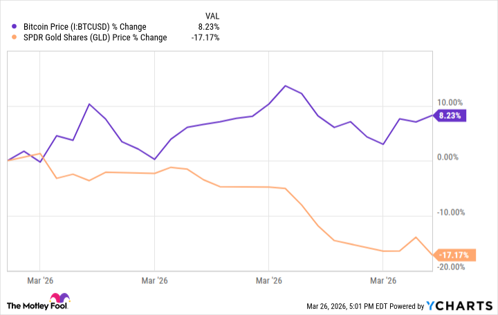 The bull case for Bitcoin is that its finite maximum supply of 21 million coins make it a form of digital gold. Gold can hedge inflation and tends to see inflows during geopolitical conflicts, although it has struggled this time around. Part of this can be attributed to a stronger U.S. dollar, with which gold has historically had an inverse relationship.