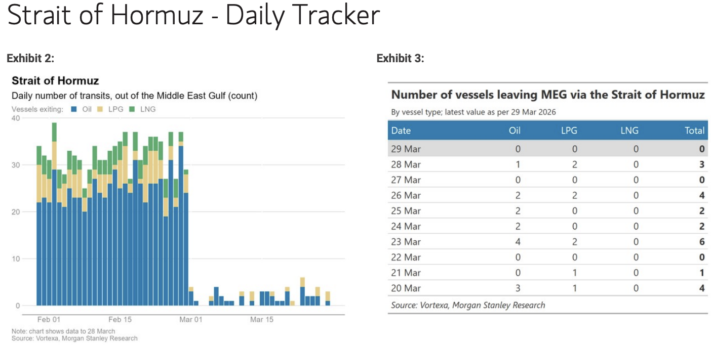 According to Morgan Stanley’s 28th daily tracking report on the Strait of Hormuz published on March 29, no vessels were detected completing transit on Sunday. Although three vessels were recorded passing through on Saturday, the overall traffic remains extremely limited and far from returning to normal levels.