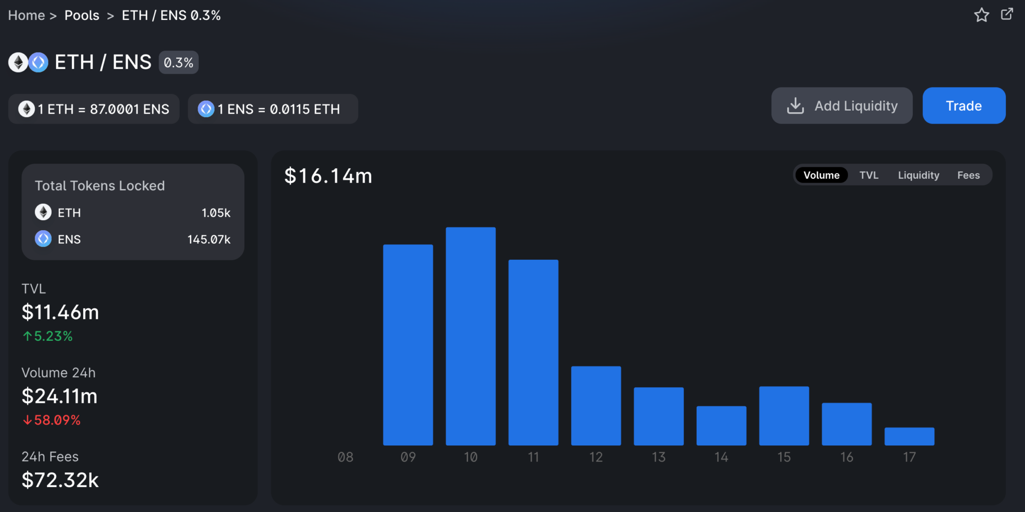 実際のUniswapサイトを見ると、ETH-ENSプールは過去24時間で72,320ドルを生み、その全額が流動性提供者へ比例配分されています。